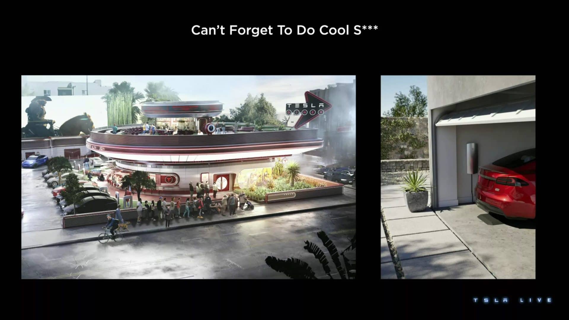 在继续四个多小时的特斯拉首个年度投资者日期间,该公司共享了一些有关其未来方案的风趣细节。其中最吸引人的是它对未来目的地餐厅和免下车影院充电站点的愿景,这在屏幕上只显现了大约十秒钟。这个概念或许也暗示了一个无线充电的免下车码头,尽管现在还缺少细节。