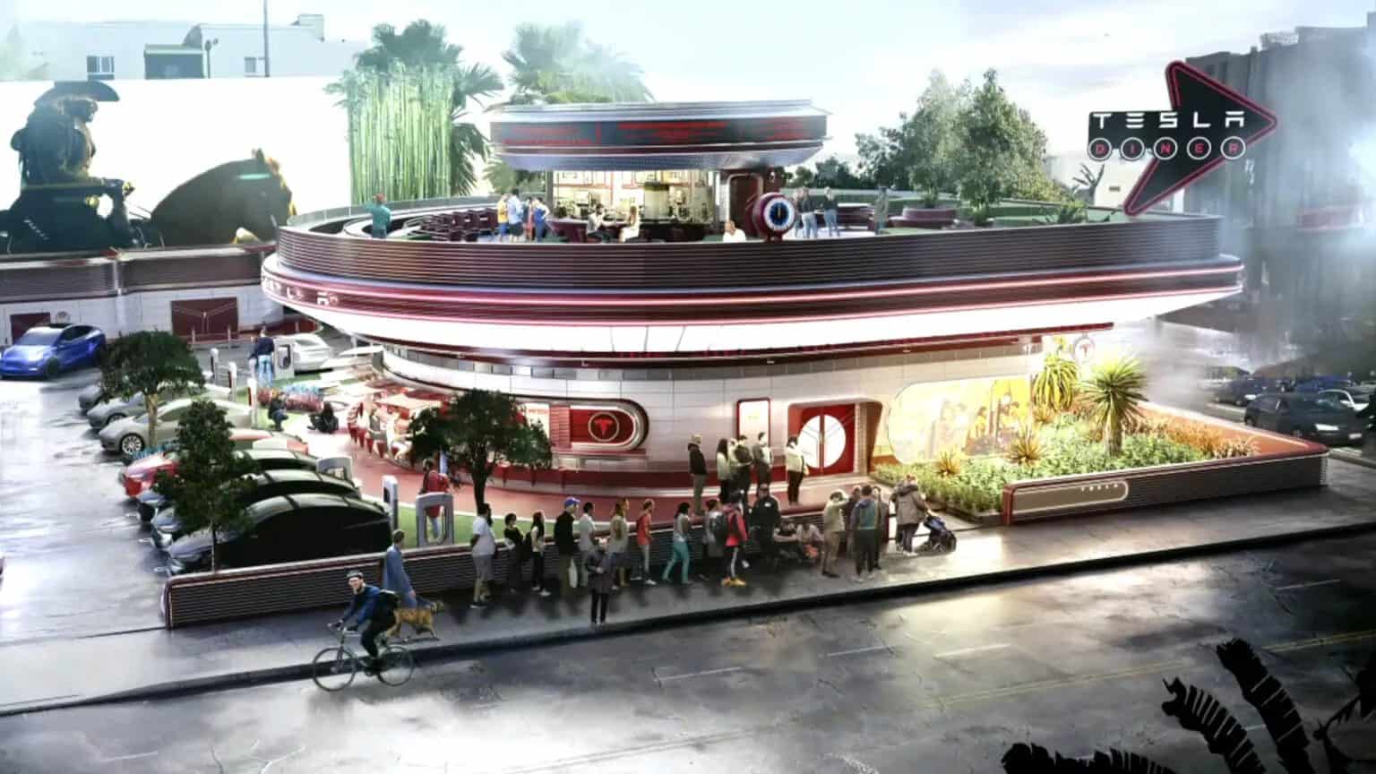 在投资者日,特斯拉充电基础设施高档总监 Rebecca Tinucci 表明,该方案的一部分是供给“真实令人难以置信的充电体会”。与此一起,你在上面看到的图画出现在屏幕上。它显现了一栋两层楼的修建,具有老派的规划气氛,角落里有一个 Tesla Diner 标志。